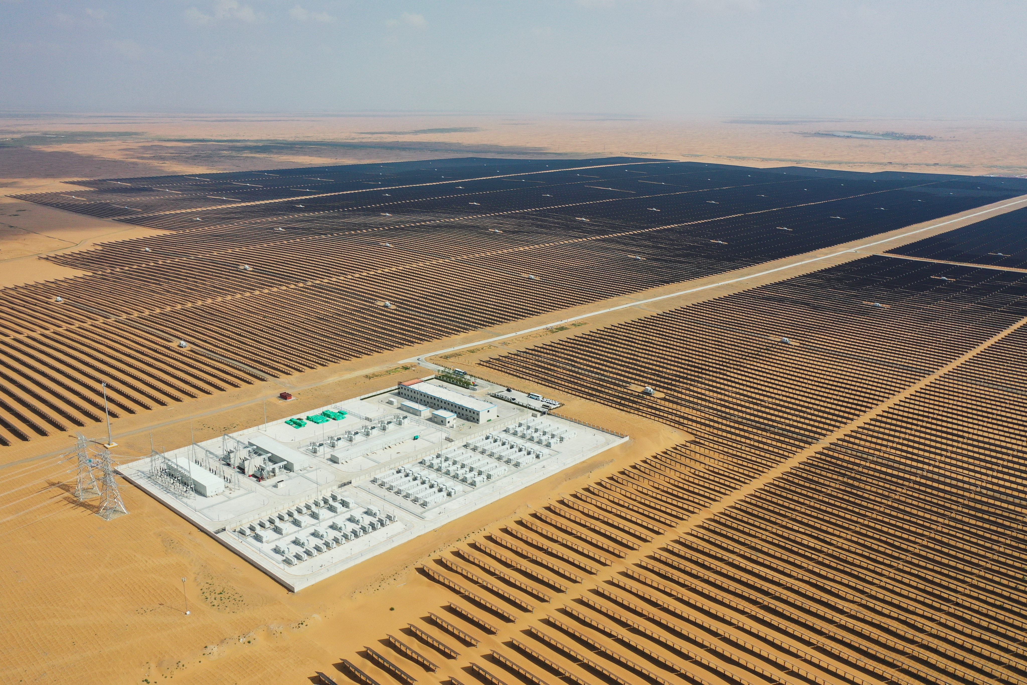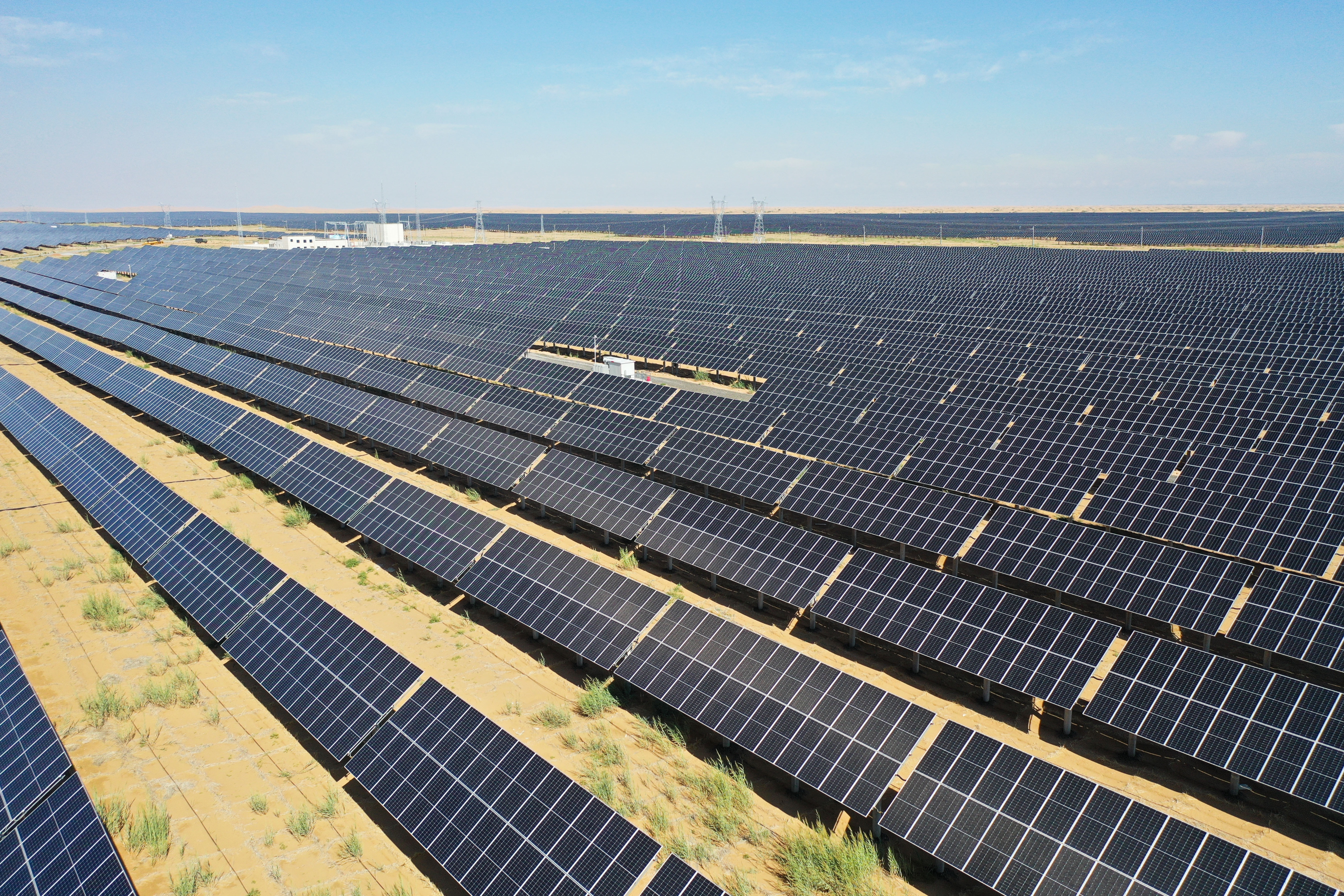 沙漠深处,一张张蓝色光伏板如波浪般向天际延伸,它们静静地吸收着炙热的阳光,将不毛之地变成巨大的“绿色电站”。